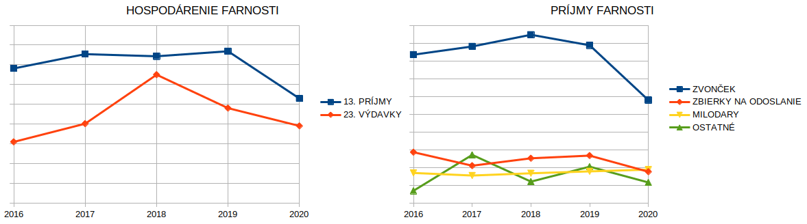 Najvýraznejšie klesol zvonček a zbierky pre farnosť. Je to spôsobené tromi faktormi: 1. Kvôli opatreniam dočasne klesol počet veriacich na bohoslužbách. 2. Z hygienických dôvodov sme pozastavili vyberanie do zvončeka počas svätej omše a k dispozícii sú len pokladničky. 3. Uvedomujeme si výrazné zaťaženie, ktoré pandémia niektorým rodinám priniesla. Preto sme nateraz pozastavili aj farské prvonedeľné zbierky.